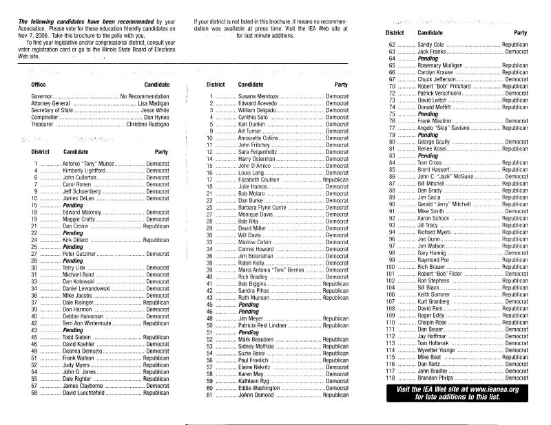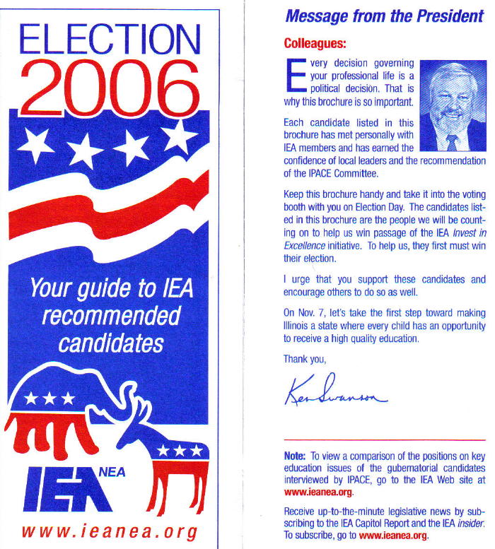 The IEA would appreciate your consideration of these recommendations as you head out to the polls on November 7th. (By the way...Illinois also offers "early voting" for your convenience. You do NOT have to have an "excuse" as in absentee voting...you just go in, show identification as a registered voter, and VOTE!)