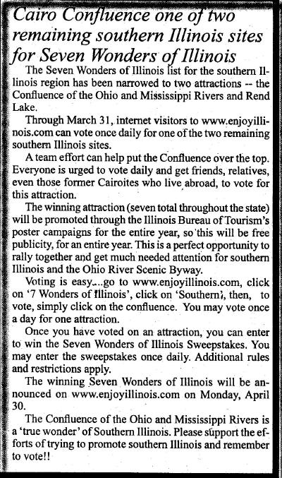 ...to vote. No...not the Cairo City Elections! It's the final chance to make the Cairo Confluence one of the "Seven Wonders of Illinois". From the Cairo Citizen...