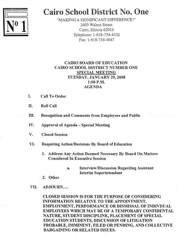 The Cairo Board of Education held a Special BOE Meeting on Tuesday, January 29, 2008, at 6 p.m. "for the purpose of interviewing candidates for Assistant Interim Superintendent." Below are the "minutes"...