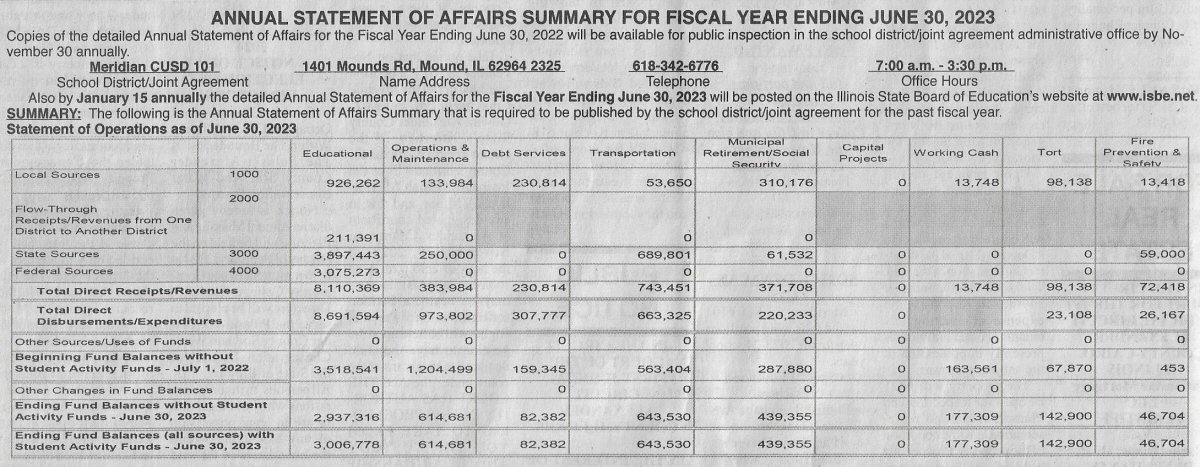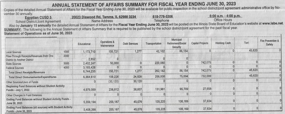 As is indicated in the fine print of the "exhibits" provided below, every public school district in Illinois is required to prepare an "Annual Statement of Affairs Summary", make it available for public inspection in the district administrative office by December 1st, and publish it in the local newspaper. (This annual edition is later than usual because Cairo did not publish in "The Pub" until January 15th.)