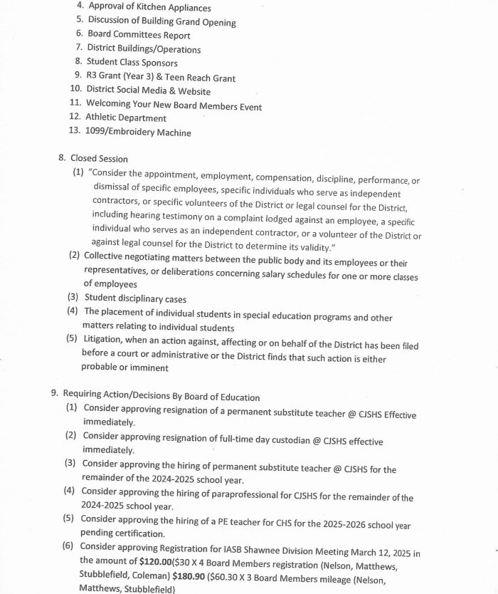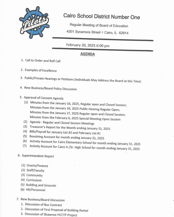 The Cairo Board of Education will hold a Regular Meeting on Thursday, February 20th, beginning at 6:00 p.m.