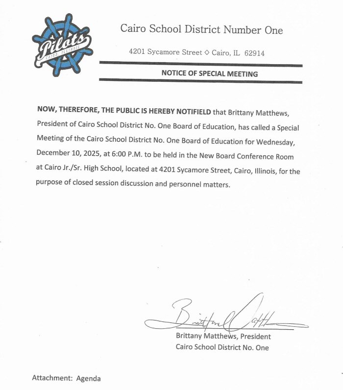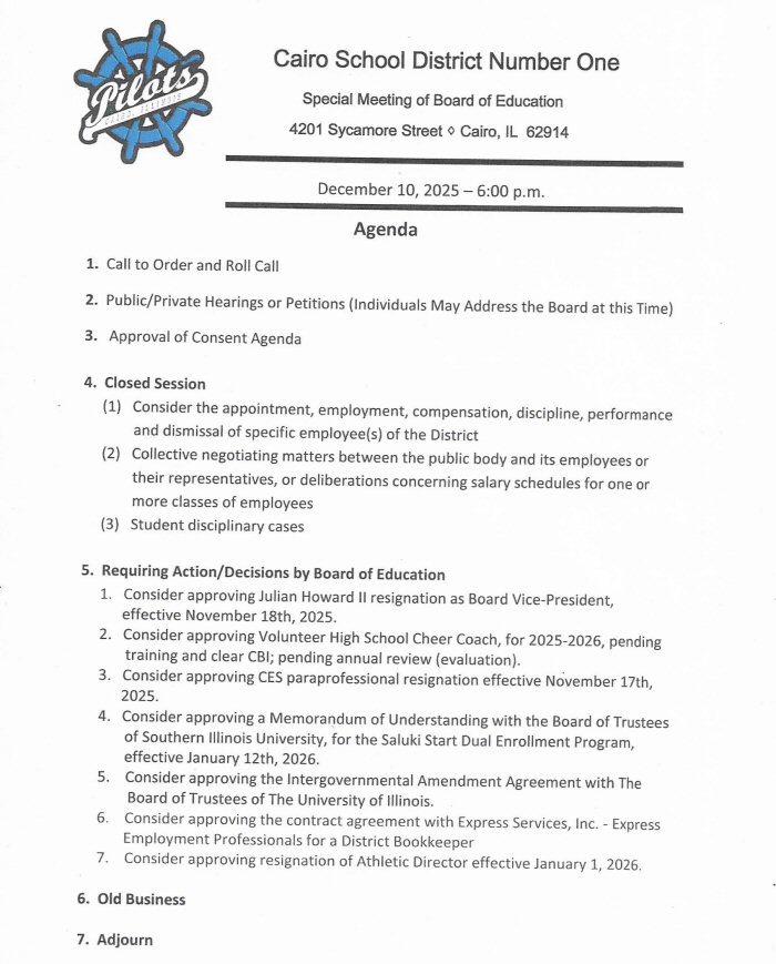 The Cairo Board of Education held a Special Meeting on Wednesday, December 10th, at 6:00 p.m.