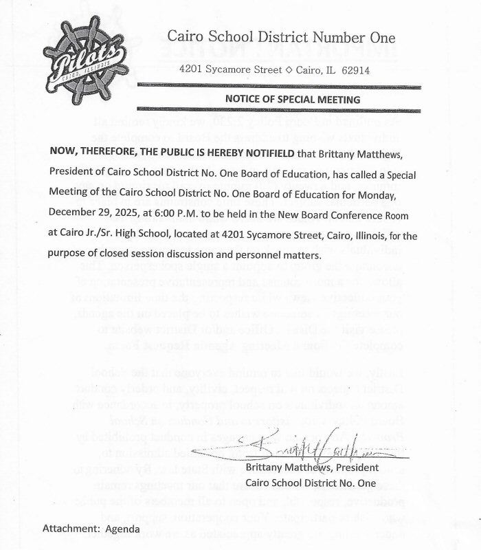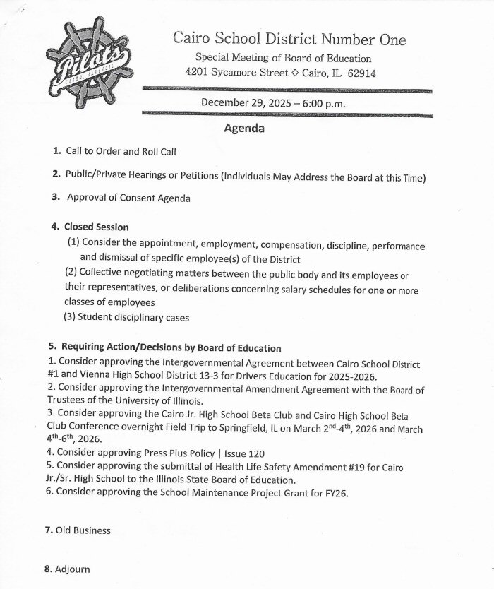The Cairo Board of Education will hold a Special Meeting on Monday, December 29th, at 6:00 p.m. The notice and agenda are below...