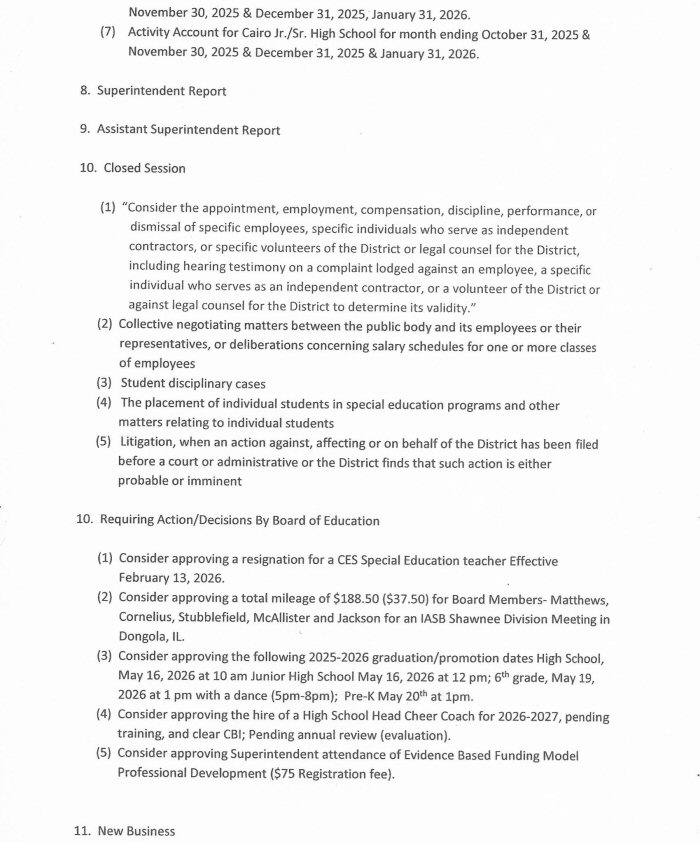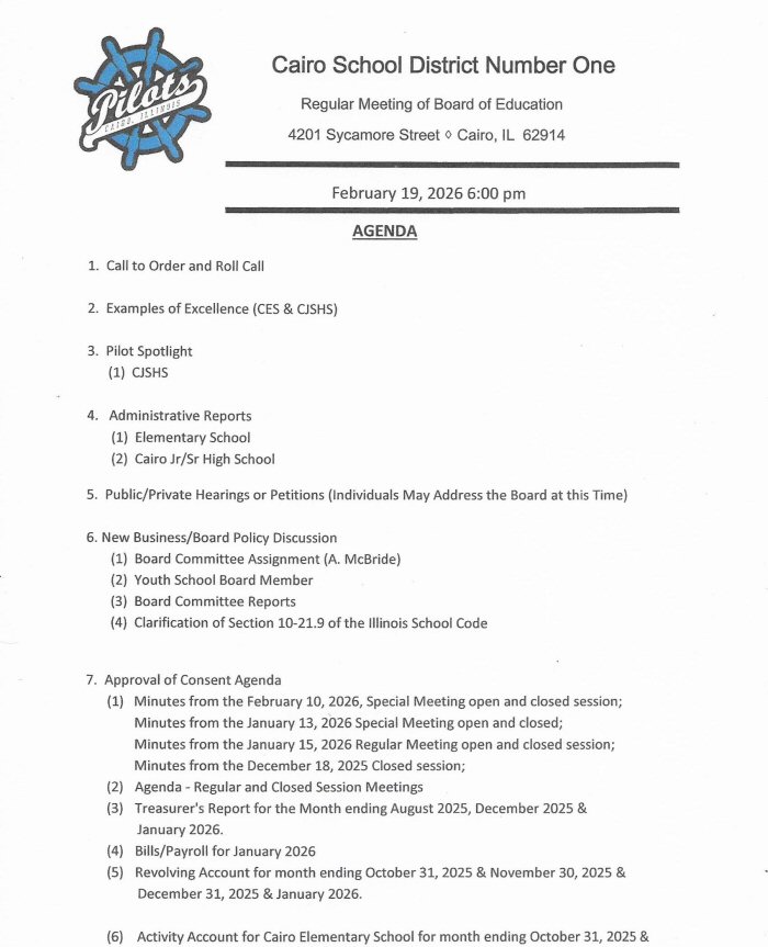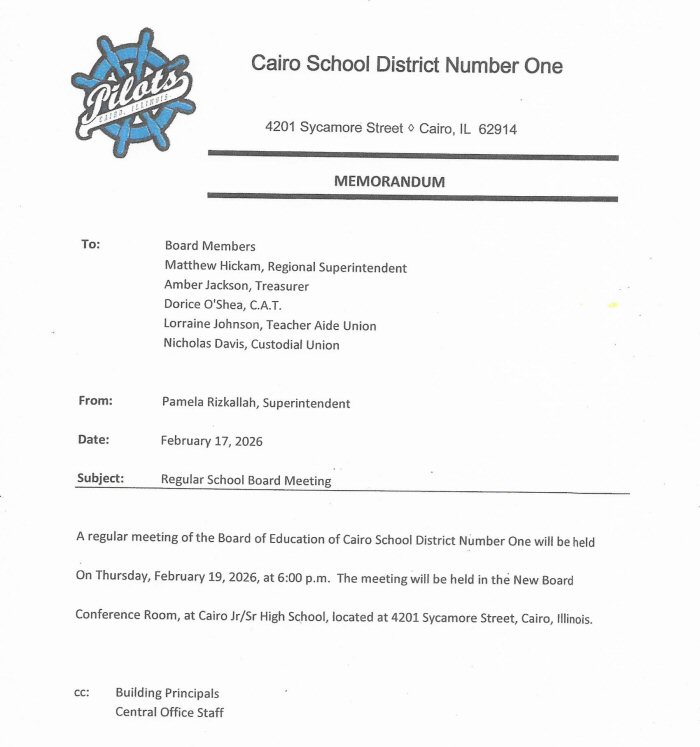 The Cairo Board of Education will hold a Regular Meeting on Thursday, February 19th, beginning at 6:00 p.m.
