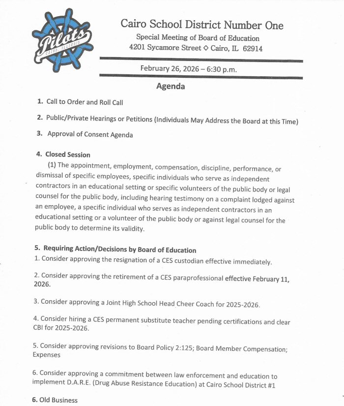 The Cairo Board of Education will hold a Special Meeting on Thursday, February 26th, at 6:30 p.m. The notice and agenda are below...
