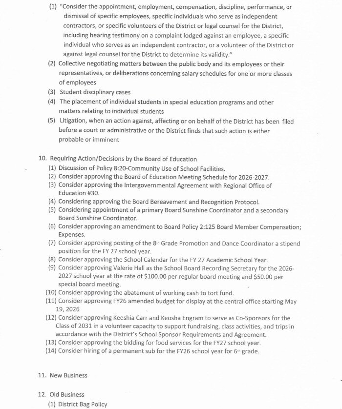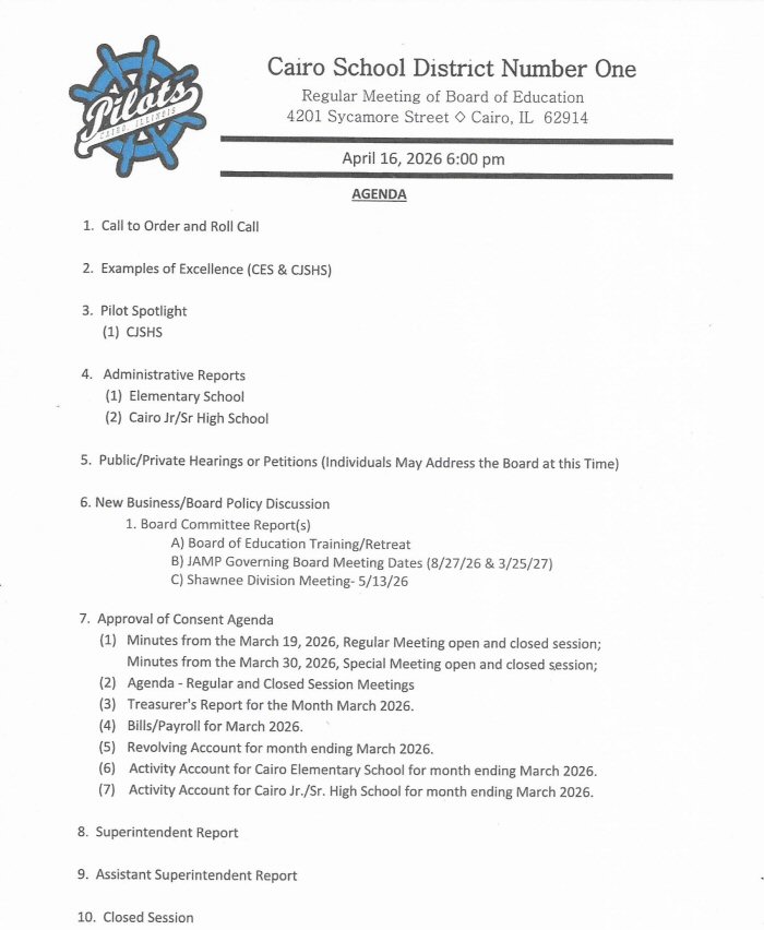 The Cairo Board of Education will hold a Regular Meeting on Thursday, April 16th, beginning at 6:00 p.m.