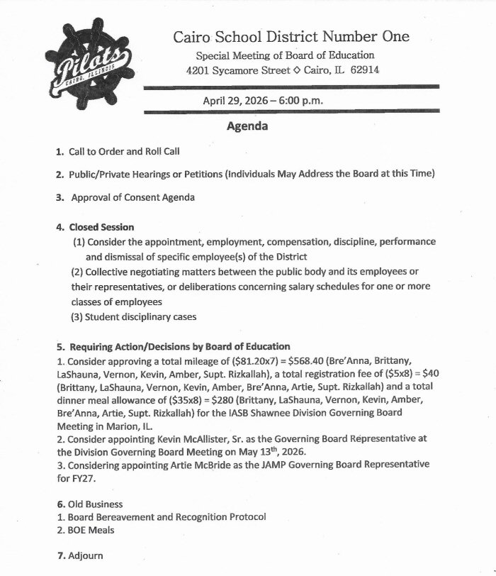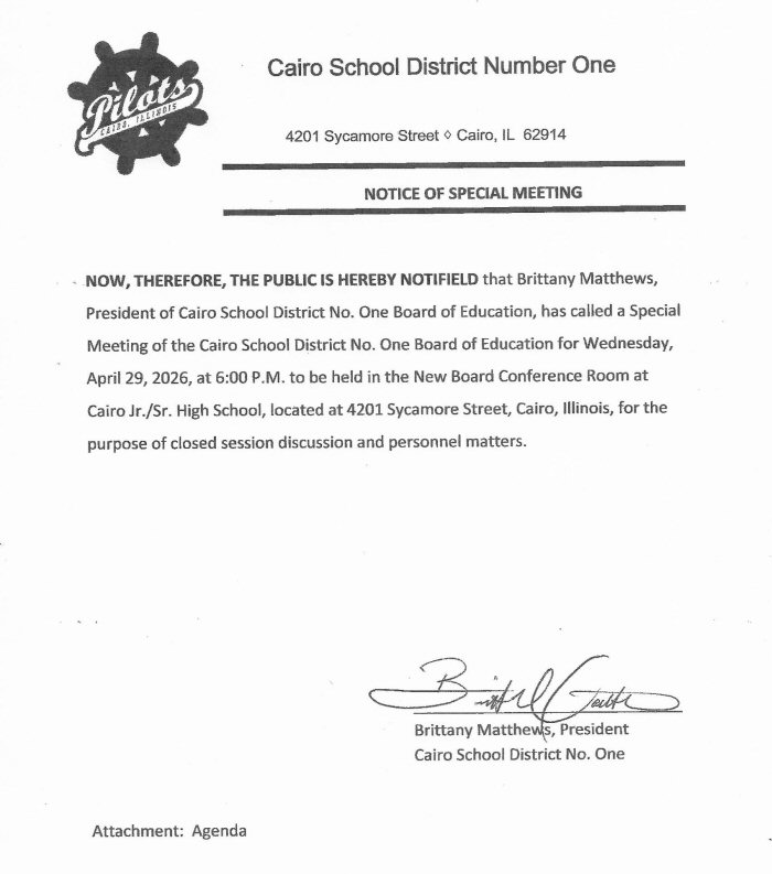The Cairo Board of Education will hold a Special Meeting on Wednesday, April 29th, at 6 p.m. The notice and agenda are below...
