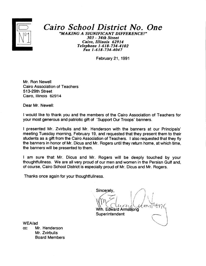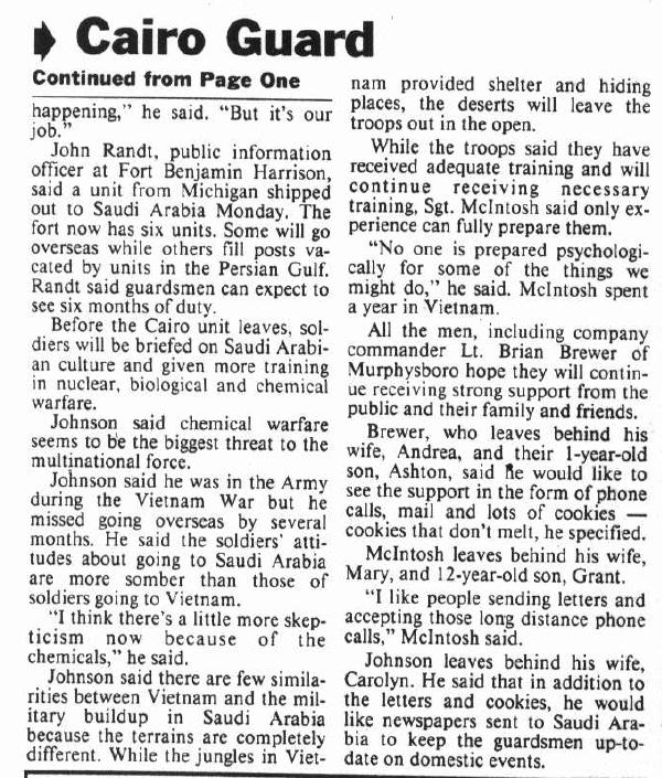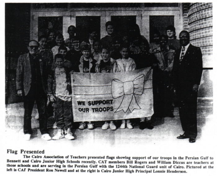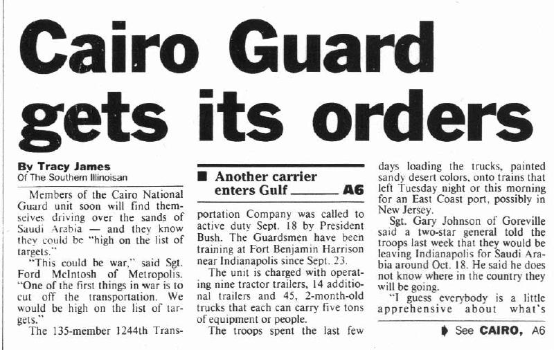 The Persian Gulf war hit home in Cairo as the local unit of the Illinois National Guard was mobilized for duty. Two members of the unit, Bill Dicus and Bill Rogers, were teachers in the Cairo School District and members of the Association. Below is an article from The Southern Illinoisan about the unit's activation...