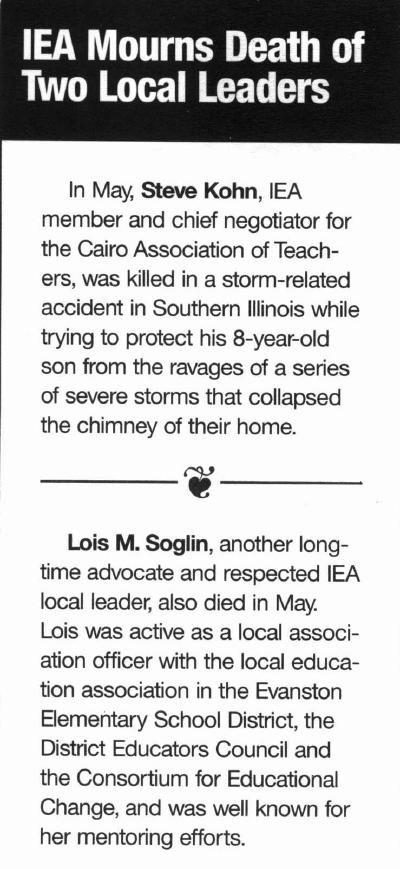 In the mail this week, you should have received the latest edition (August-September) of your IEA magazine - The Advocate. This month's issue contains the following article recognizing the loss of two leaders in the organization...
