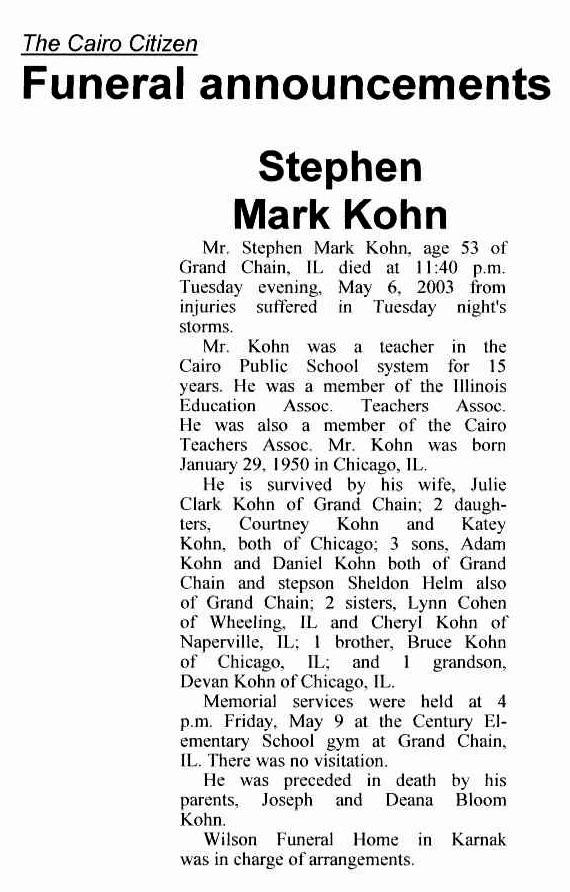 On May 6, 2003, Cairo High School teacher Steve Kohn sacrificed his life for his son, protecting him when a tornado totally destroyed the family home. In a sense, this was nothing new…Steve gave his life to his son – EVERY DAY – for eight years. Steve completely immersed himself in the raising of his son, letting his son know that he was loved, protected, and supported.
