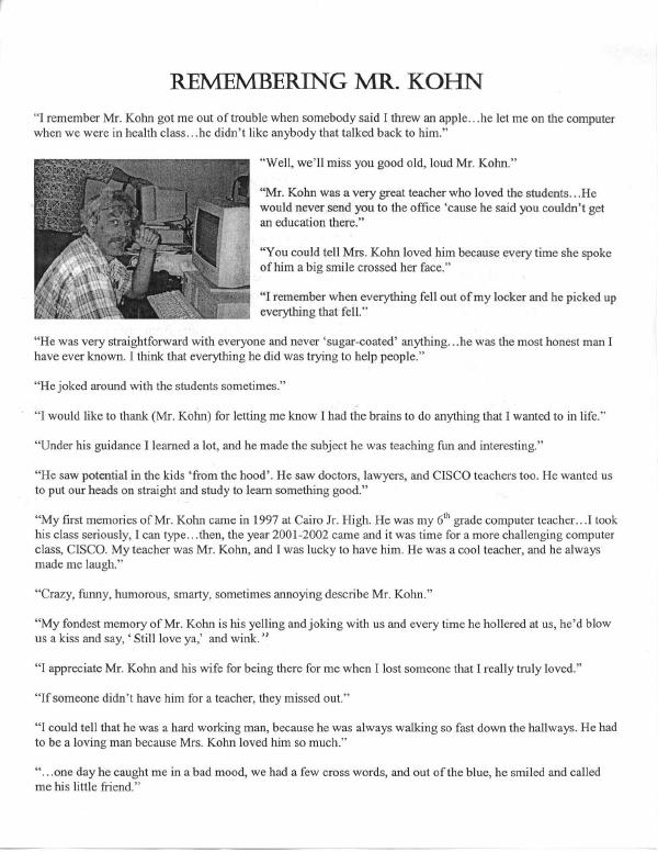 On Friday, September 19, 2003, Cairo High School students, staff, and faculty assembled in front of the school to honor Steve's memory. Student Council Sponsor Catherine Scott told the group that students had come to her asking for a memorial to Mr. Kohn and that they had specifically requested the planting of a tree. Ms. Scott secured a Ginko tree (signifying knowledge) and had it planted. When she contacted Bell Monument to secure a marker to be placed at the base of the tree, owner George Bell responded by donating it. Mr. Bell placed the marker as Dean of Students Larry Baldwin offered comments on Steve Kohn's dedication to his students and his desire that they overcome distractions and succeed in life. Mr. Baldwin offered as an example the personal experience of his daughter...who was "pushed" to succeed...but who now excells in computers. The ceremony concluded with a moment of silence in honor of the memory of Steve Kohn.