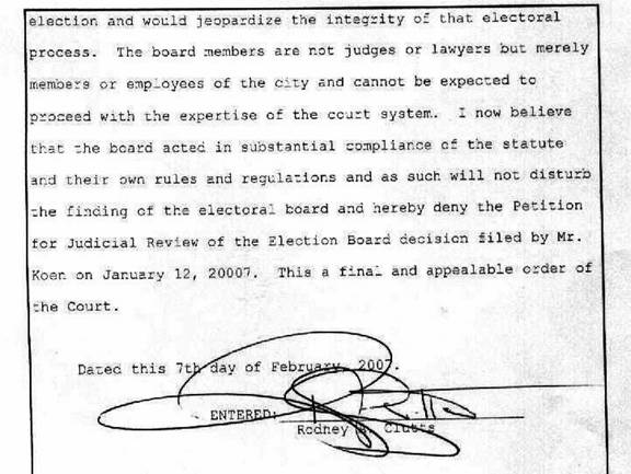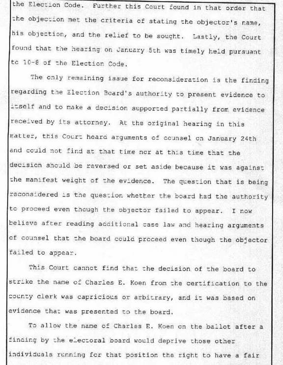 Judge reverses earlier decision, backs election board, removing Charles Koen's name from ballot...again. Decision subject to appeal...