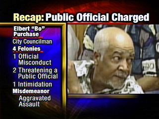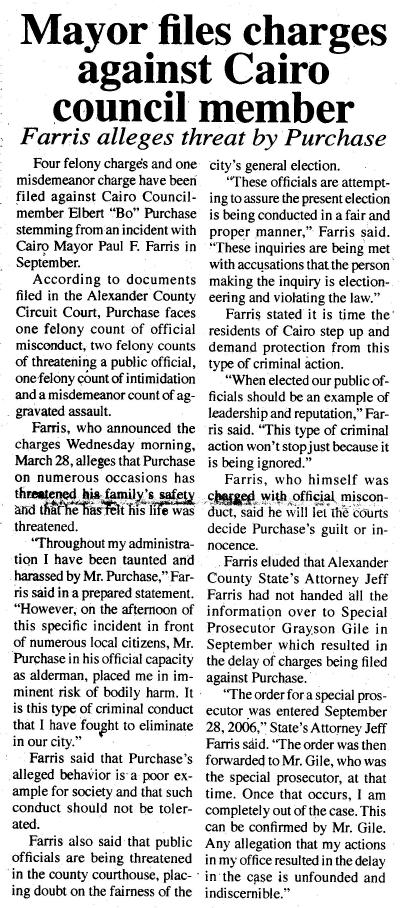 CAIRO, Ill. - A war of words in Cairo leads to a city alderman facing five criminal charges, four of which are felonies. A special prosecutor filed the charges against Elbert "Bo" Purchase on Tuesday March 27, 2007. Purchase is accused of official misconduct, threatening a public official intimidation and aggravated assault.