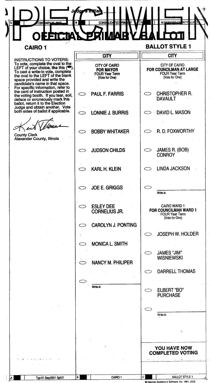 CAIRO PRIMARY BALLOT - WARD 1