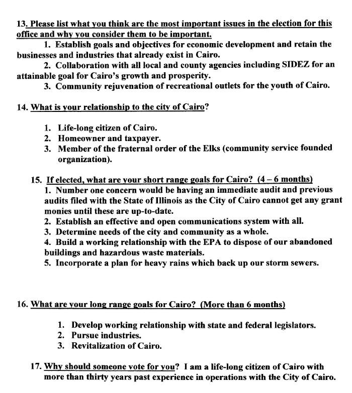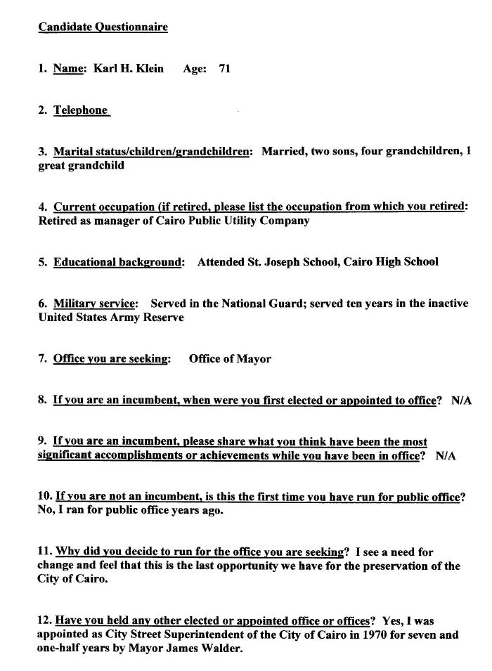 KARL KLEIN - CANDIDATE QUESTIONNAIRE
