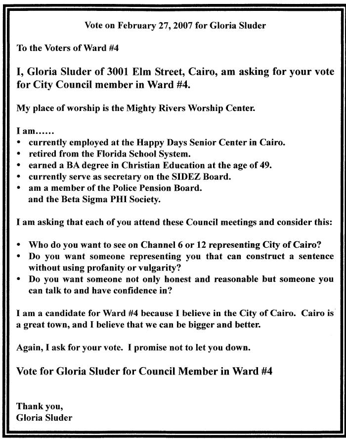 GLORIA SLUDER CAMPAIGN FLYER