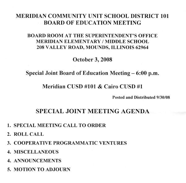 President of the Meridian School Board, George Floyd, opened the meeting by indicating that the notice of the meeting as published by the Meridian BOE to its public was in error as to the date...stating October 3rd, instead of October 2nd. Therefore, they could NOT have an official meeting.